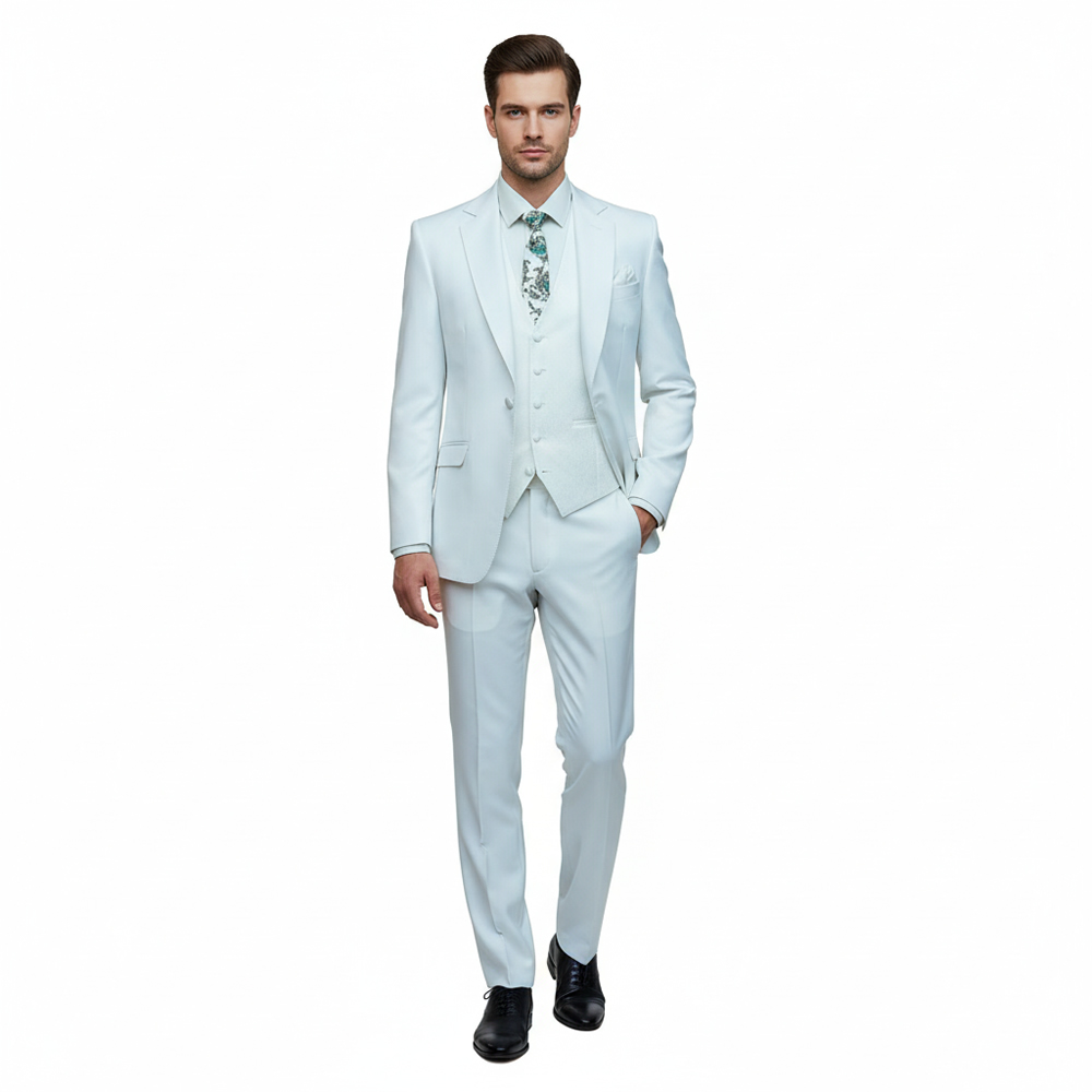 This all white 3 piece suit is designed for timeless style and a flawless fit. The jacket features a sharp notch lapel with a clean finish, paired with a textured white V-shape vest that adds depth and detail to the look. Crafted with free customization, fit guarantee, and delivered worldwide, it’s the perfect choice for weddings, formal events, and standout occasions.