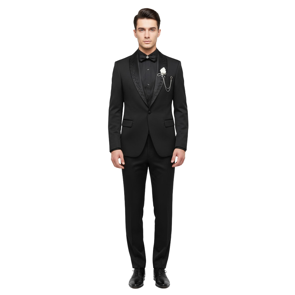 Step into the spotlight with our exclusive Black Velvet Tuxedo, adorned with eye-catching crystal bead details for an extra touch of elegance. This tuxedo combines the timeless charm of velvet with a hint of sparkle, perfect for making a statement at any high-end event.