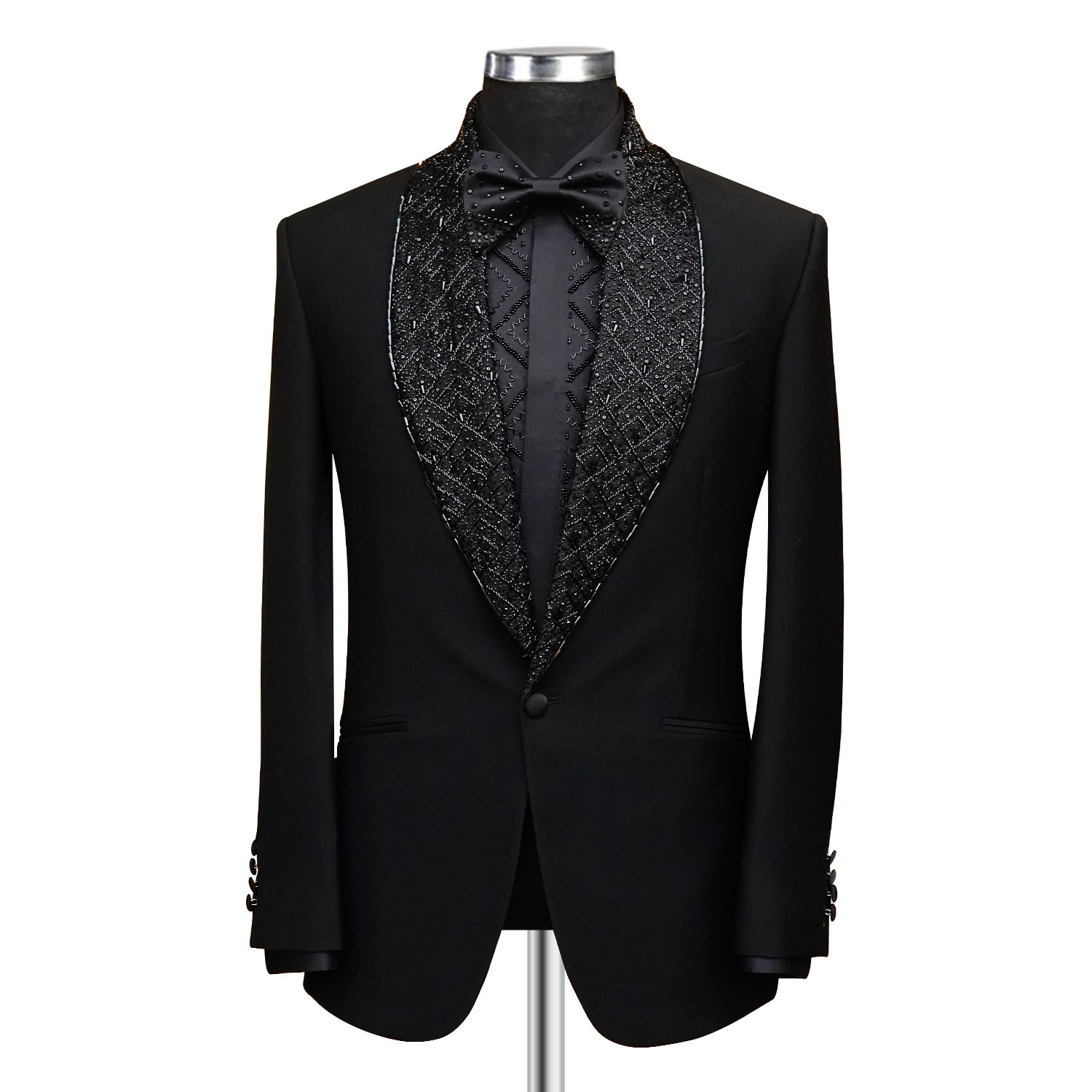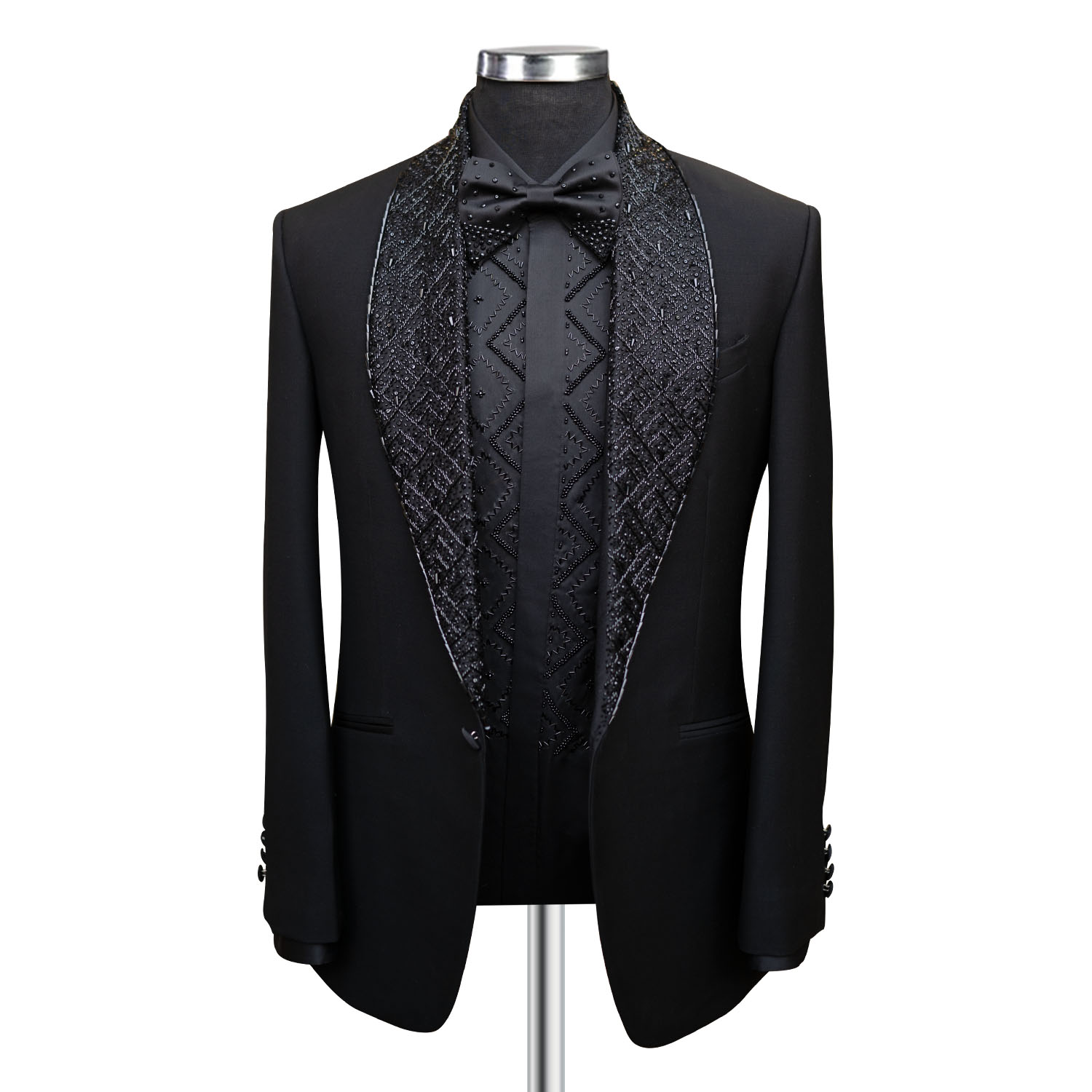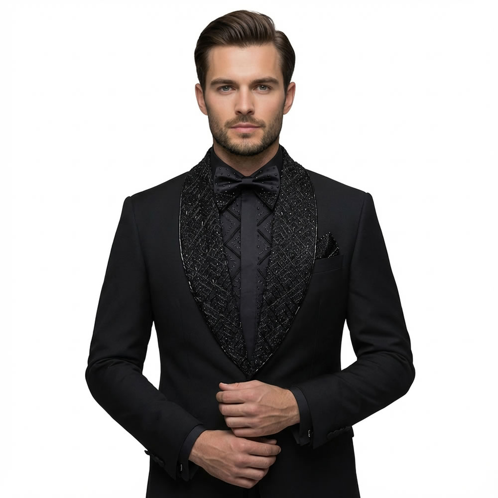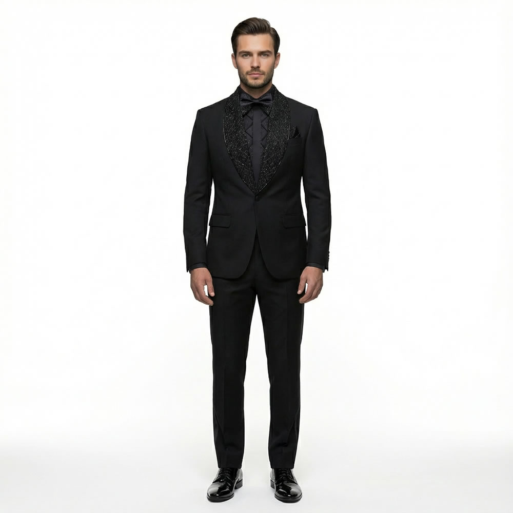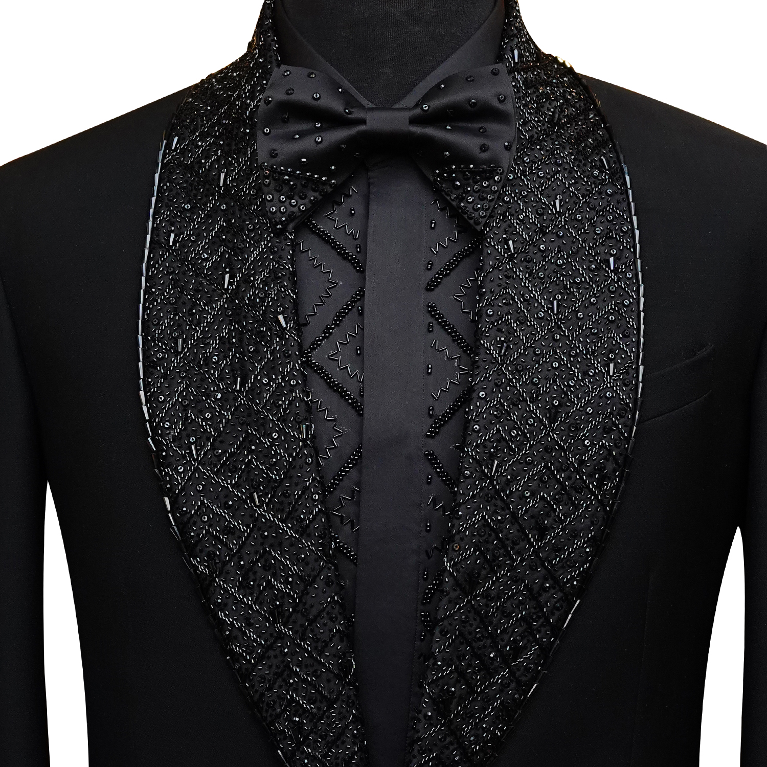 Explore elegance with Andre Emilio’s custom designer black tuxedo, featuring unique glass bead detailing on the lapel. Perfect for formal events, this tuxedo combines classic style with a modern twist. Shop now to make a sophisticated statement at your next special occasion.