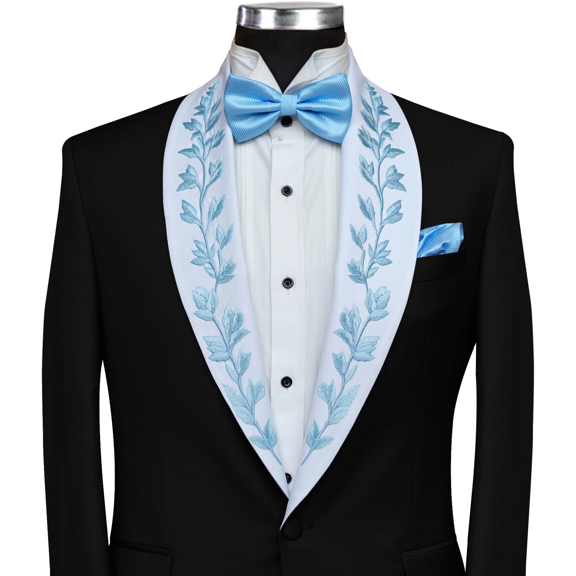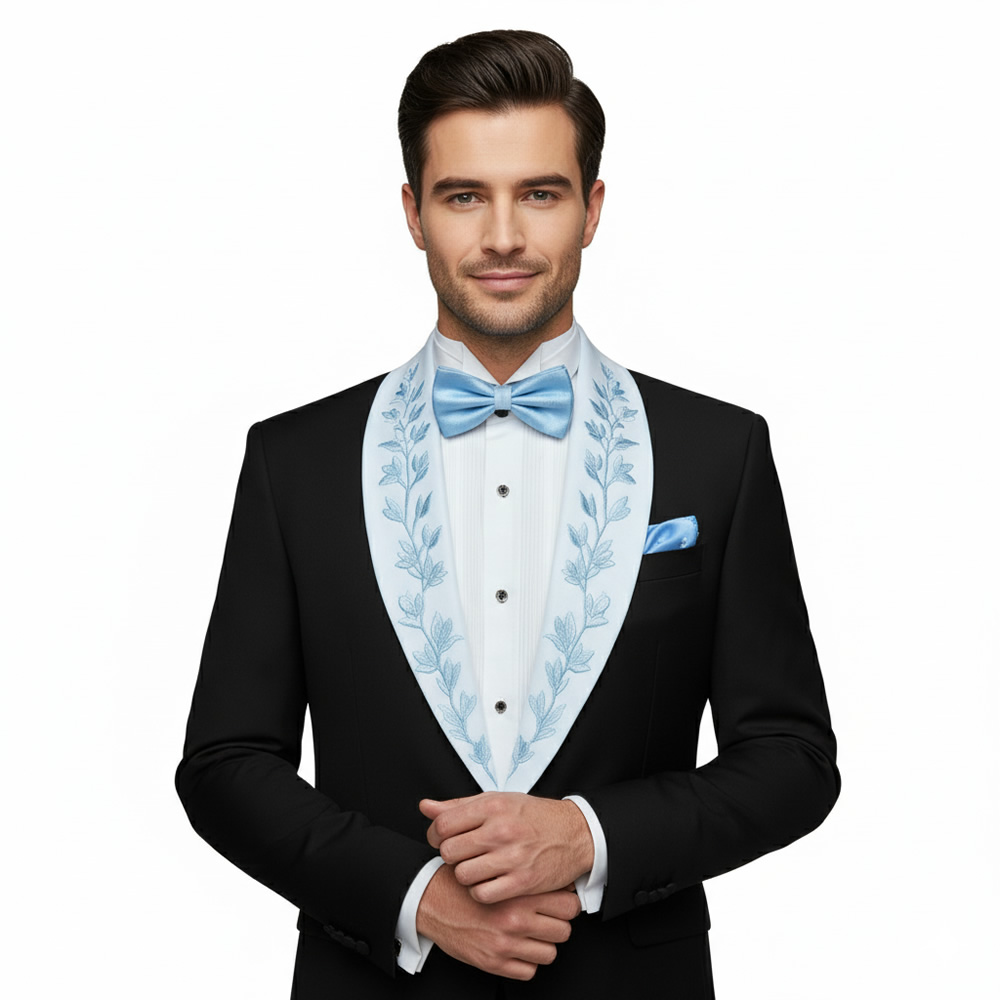 Turn heads in this premium black tuxedo designed with a sleek white lapel and refined blue floral embroidery for a modern, elegant touch. Crafted with high-quality fabric, it features a tailored fit, detailed stitching, and a matching bow tie for a complete formal look. Customization is available for size and fit.