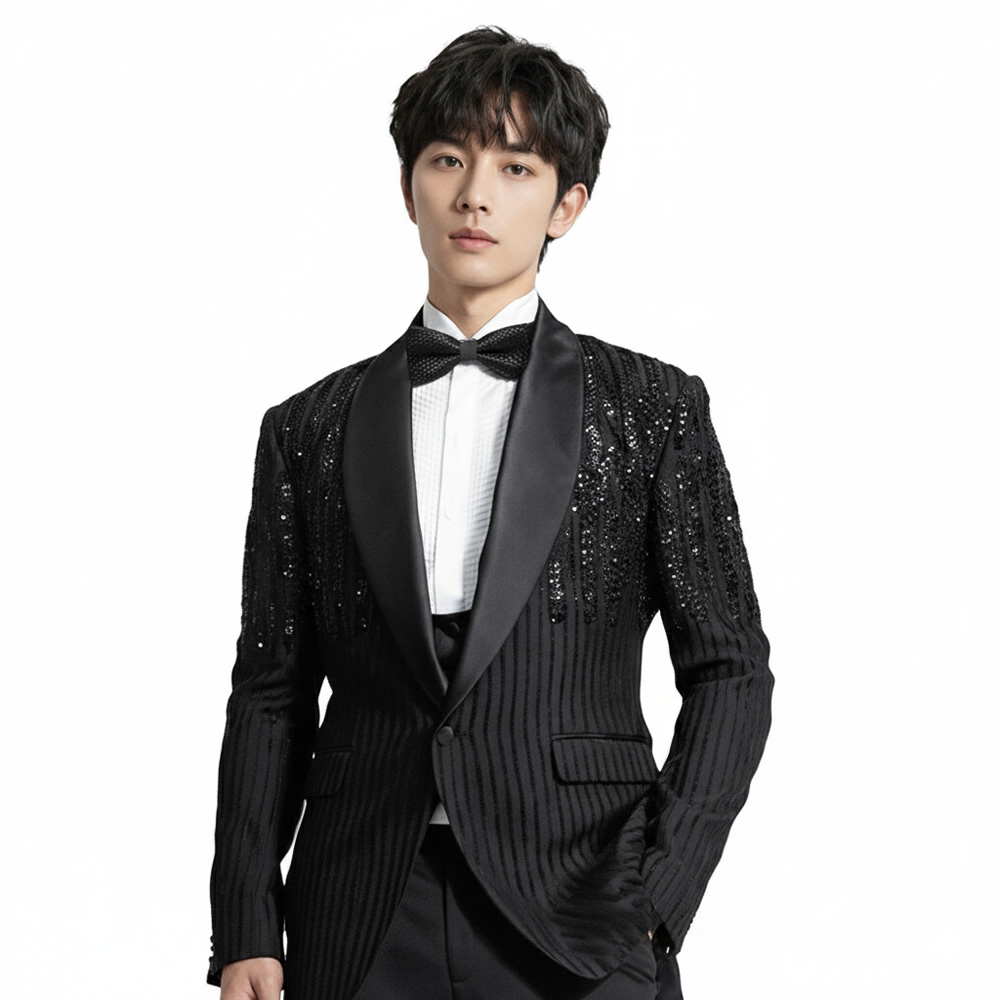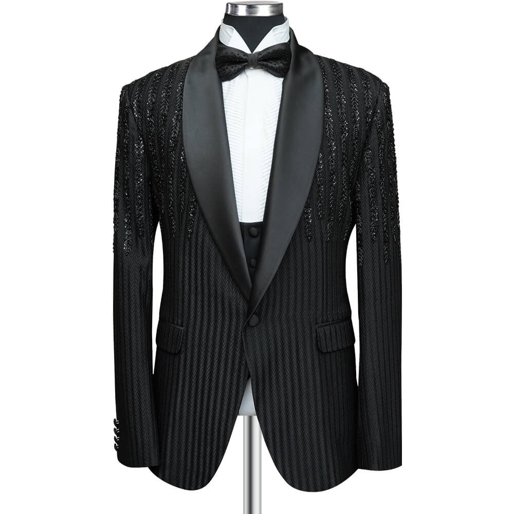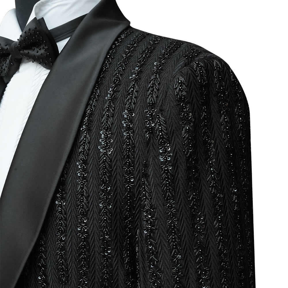 Explore elegance with Andre Emilio’s custom designer black tuxedo, featuring unique glass bead detailing on the lapel. Perfect for formal events, this tuxedo combines classic style with a modern twist. Shop now to make a sophisticated statement at your next special occasion.