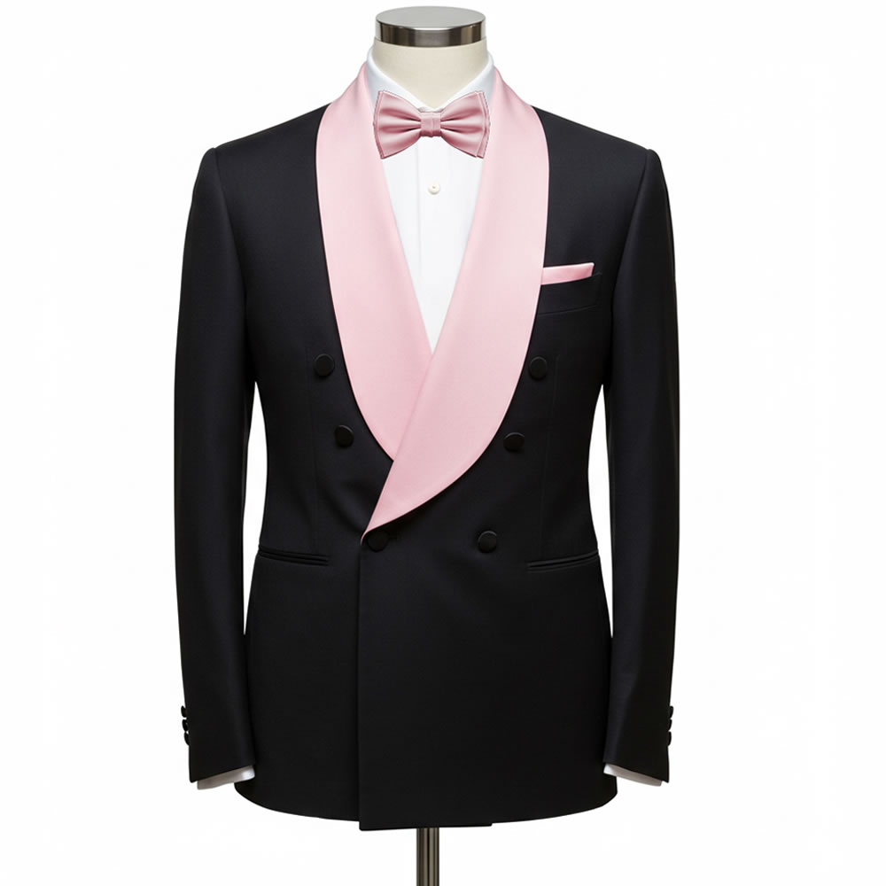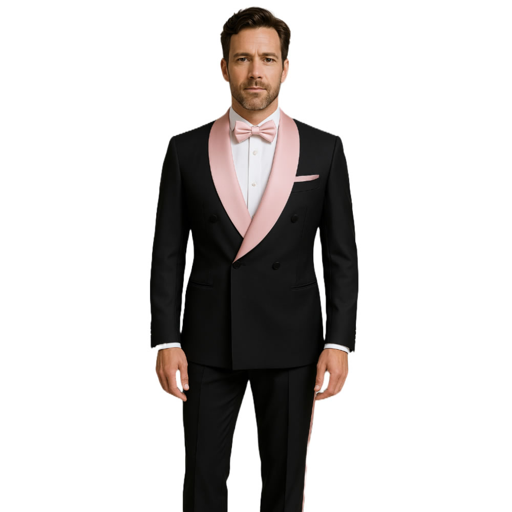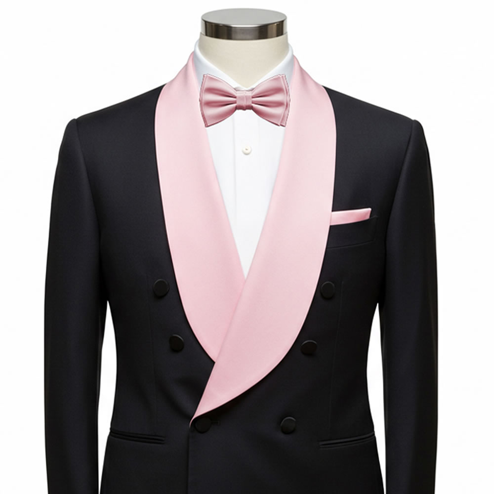 Picture this: You walk in. The black fabric drapes like liquid confidence. The pink lapel? A wink of rebellion in a sea of monotony. This tuxedo’s for the guy who’s tired of blending in – maybe a groom who wants his suit to match his bride’s bouquet, or a prom date who’s done with basic black. Lightweight, tailored, and built to move with you (no starched-stiff disasters).