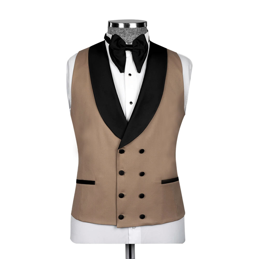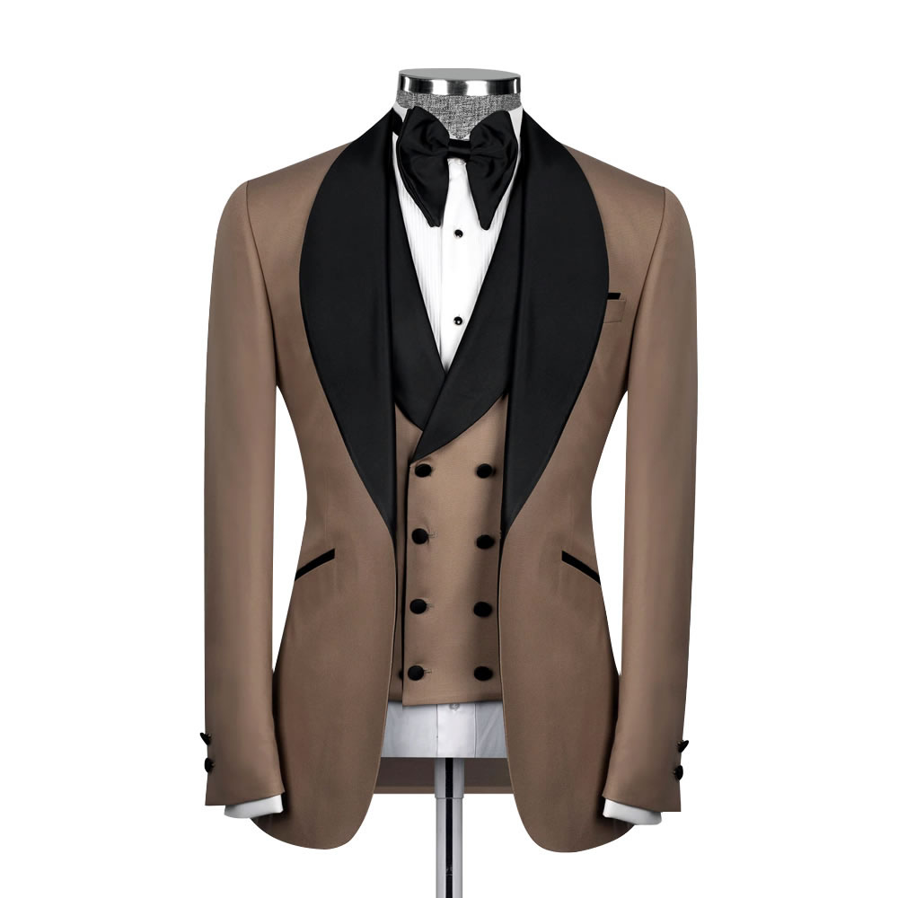 Upgrade your formal wardrobe with our Brown Tuxedo with Black Lapel, crafted from premium 120s fabric and luxurious silk lining for year-round comfort. Featuring a plain pattern, black fabric buttons, and a half-canvas construction, this tuxedo offers a perfect tailored fit. The shawl lapel jacket includes two diagonal pockets and a single button closure, while the shawl lapel waistcoat boasts an 8-button double-breasted design. Paired with brown flat-front trousers, this ensemble ensures you make a lasting impression at any event.