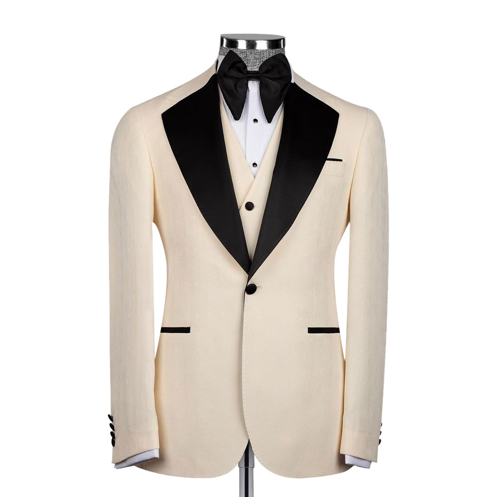 The cream tuxedo with black lapel is where classic elegance meets contemporary style. The rich cream fabric and contrasting black lapel make a powerful statement, while the tailored fit guarantees a sleek, polished appearance for any formal gathering.
