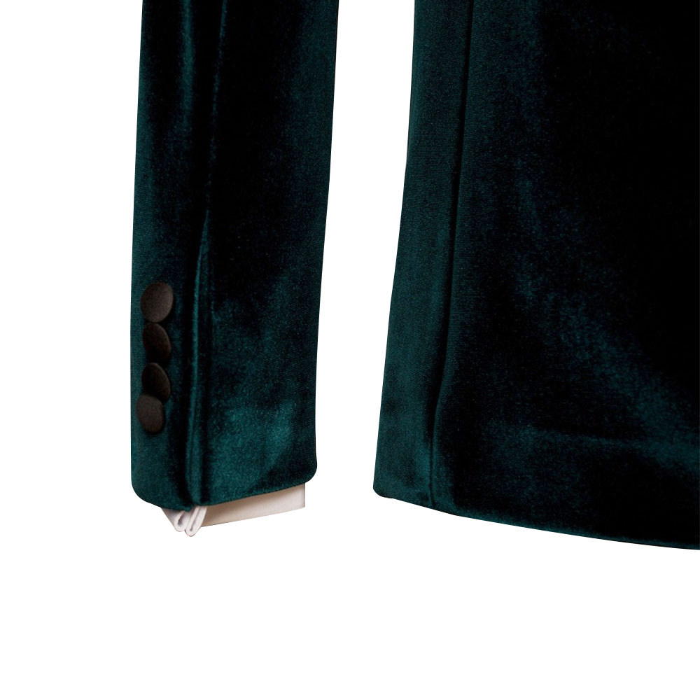 The jacket boasts a satin shawl lapel, perfectly complementing the dark green velvet. Its straight pockets provide functionality without compromising style. The single-button closure ensures a streamlined and contemporary look.