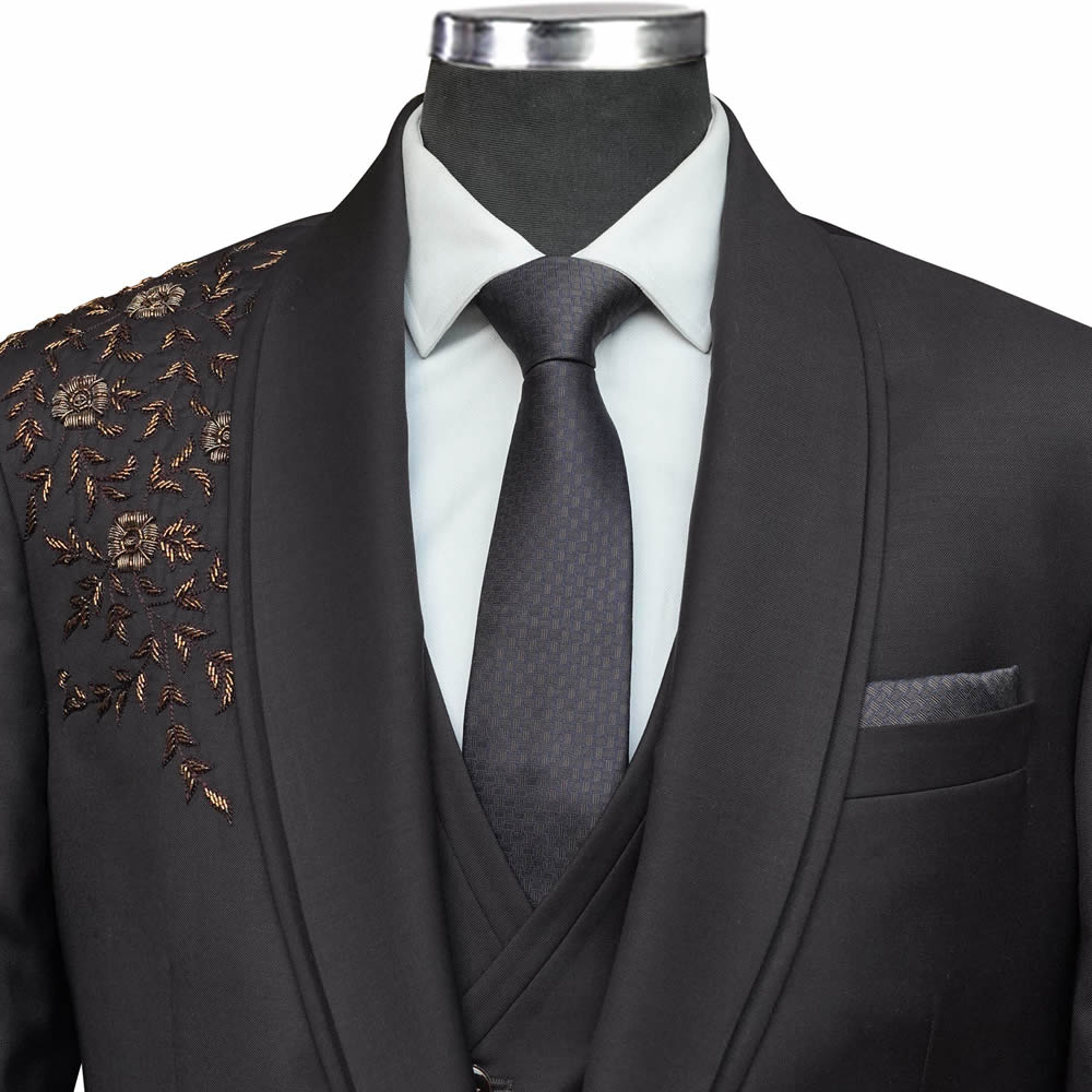 The custom black 3 piece suit with shawl lapel will be tailored to your unique measurements for a perfect fit. Our digital tailoring team will work closely with you to understand your requirements before hand-stitching your custom tuxedo.