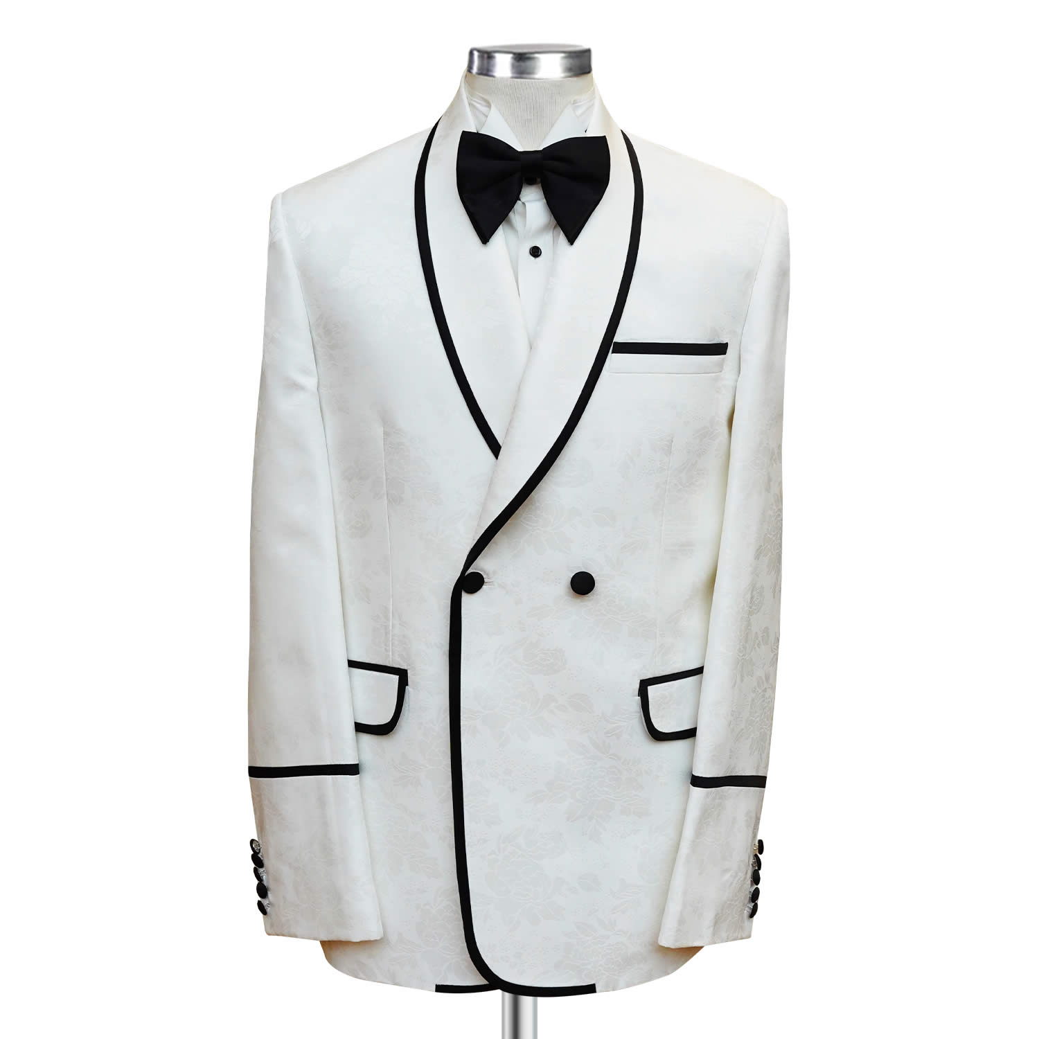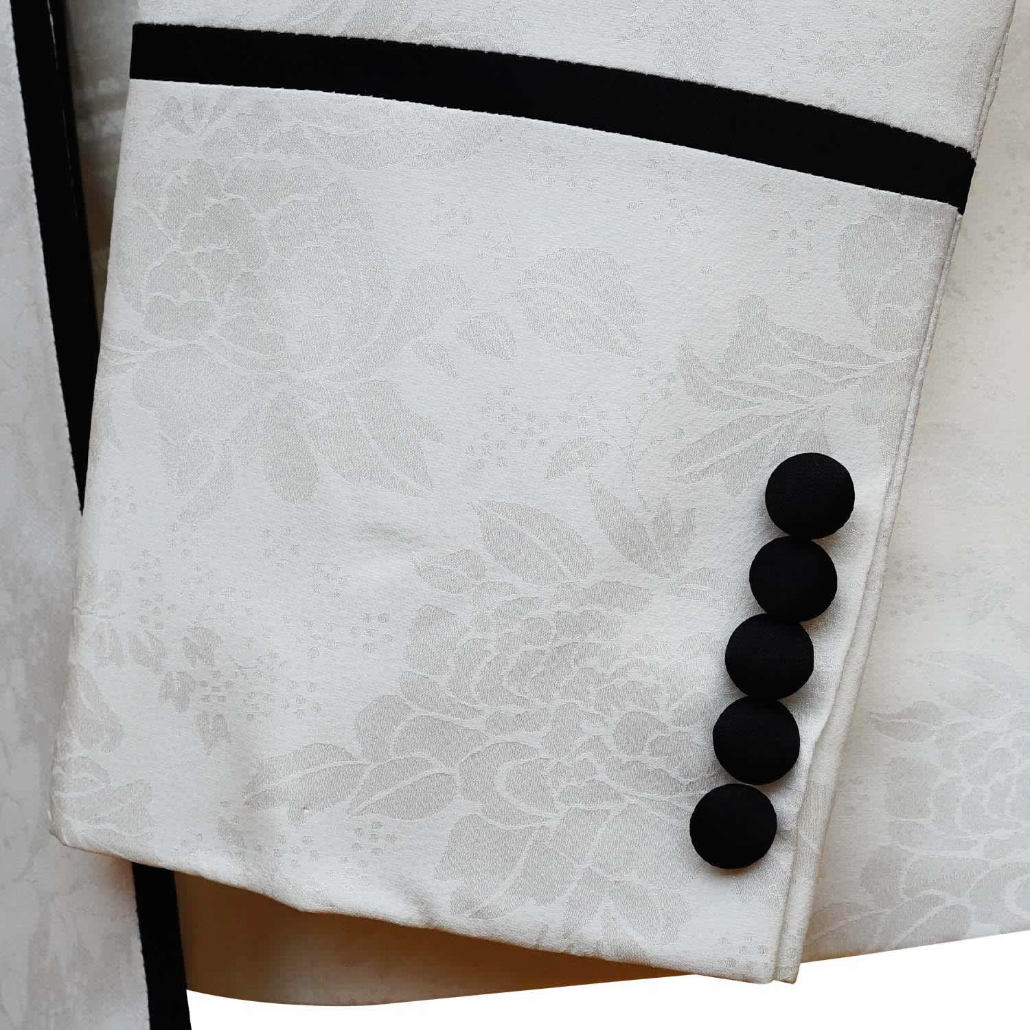 White floral jacquard tuxedo finished with clean black piping for sharp contrast. A double-breasted shawl-lapel jacket with a self-tie belt creates a sleek, wrap-like silhouette. Matching tailored trousers and smooth lining keep it comfortable and polished all night. Perfect for weddings, galas, and any black-tie event where you want a modern statement.