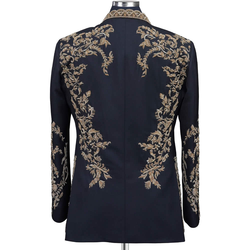 Modern men love this golden embroidered open front blazer, who really like to wear something that seamlessly blends tradition with contemporary style. Crafted from premium 120s fabric, this piece features intricate golden embroidery that adorns the mandarin collar, back side, and sleeves, making it a standout choice for any occasion. The open front blazer is constructed with a half canvas for a tailored fit that ensures both comfort and durability, while the silk lining adds a touch of luxury. It’s designed for all seasons, offering versatility in your wardrobe. The absence of a button closure provides a sleek, open-front look, perfect for those who appreciate fashion-forward designs with a nod to classic craftsmanship.