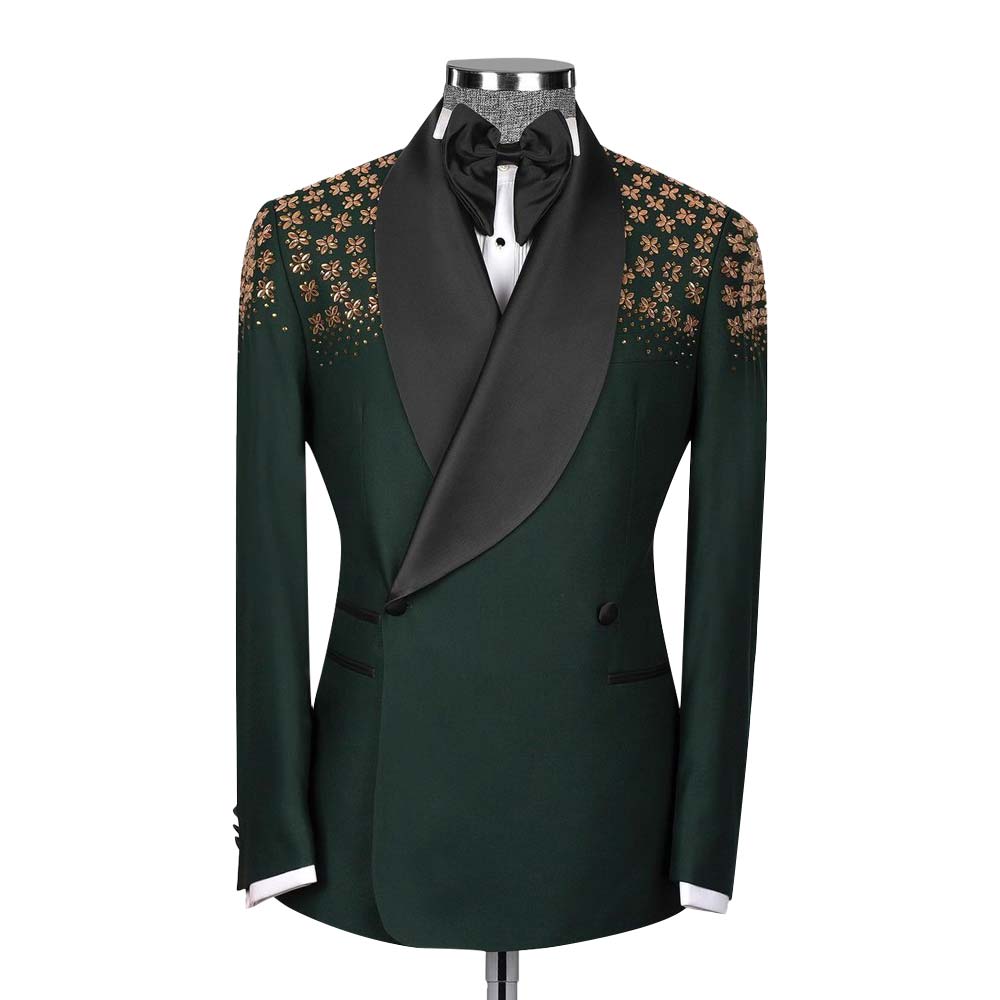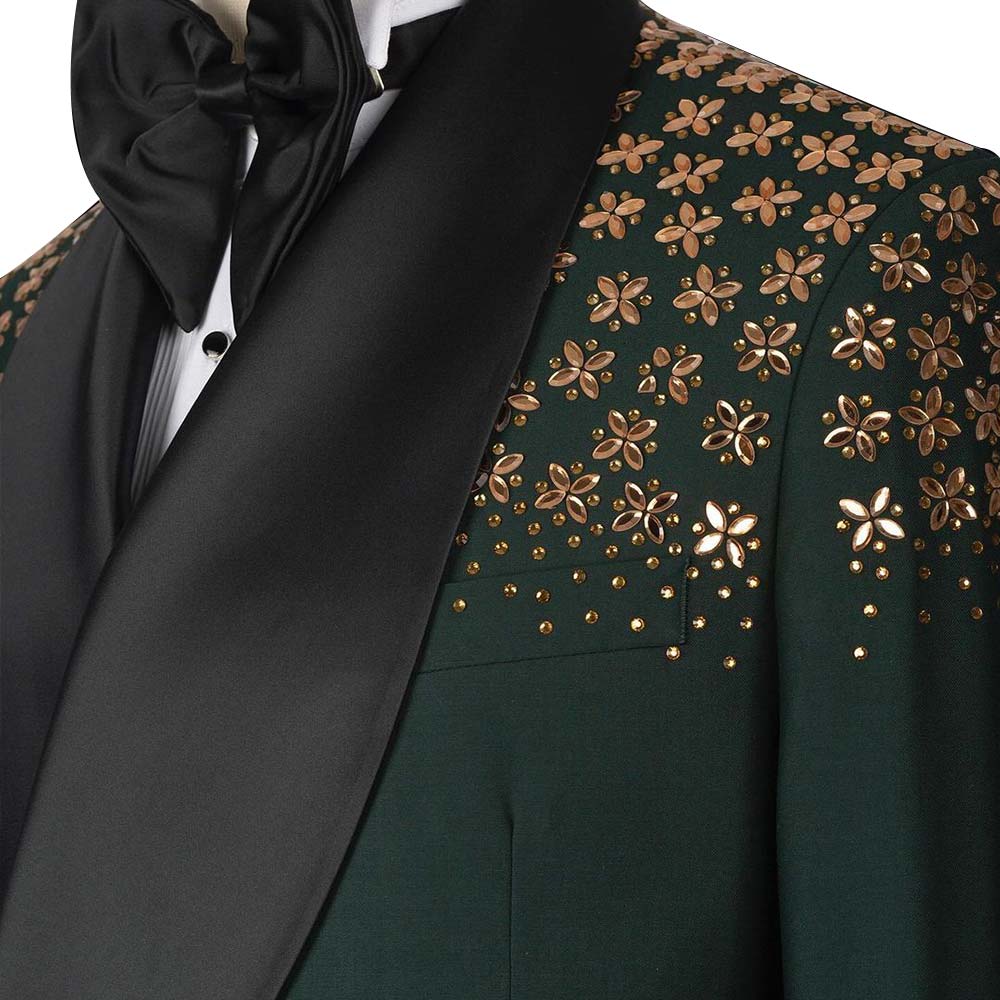 Introducing the custom green tuxedo with stone embroidery, crafted from luxurious 120s fabric with a silk lining. This all-season tuxedo features a double-breasted jacket with a shawl lapel, three straight pockets, and stunning stone embroidery on the shoulders. The flat-front trousers include two back pockets and a zip closure, ensuring style and functionality. Perfect for any formal occasion, this tuxedo combines elegance and impeccable craftsmanship.