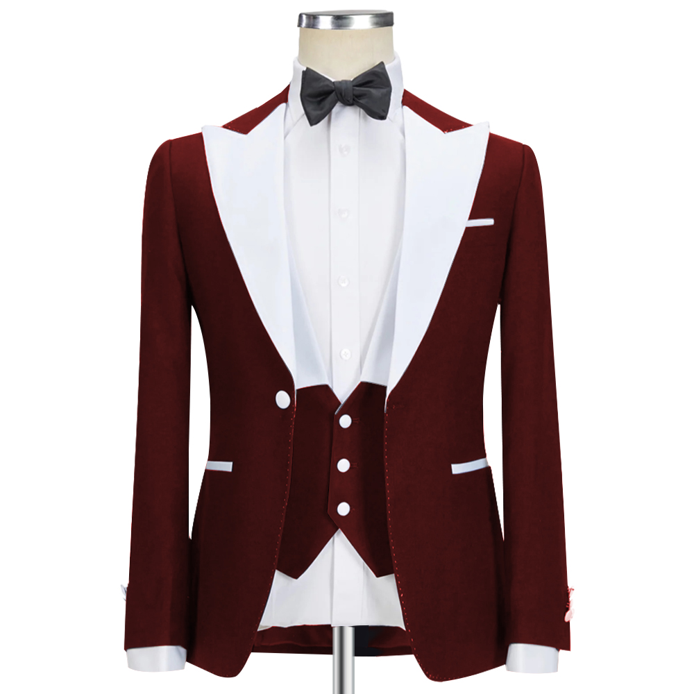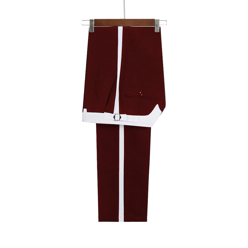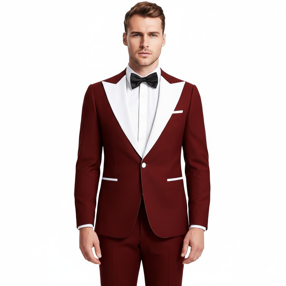 Celebrate your moment in this impeccable maroon tuxedo, distinguished by its crisp white lapel. Expertly constructed with premium 120s fabric, half canvas build, and a luxurious silk lining.