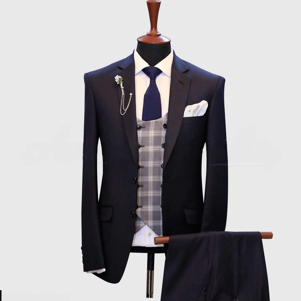 The bespoke textured grey suit is the epitome of luxury. Our expert designers have combined cashmere with our top-selling Italian tropical Blue Suit, featuring a Check Waistcoat, to create a truly sophisticated and refined piece.