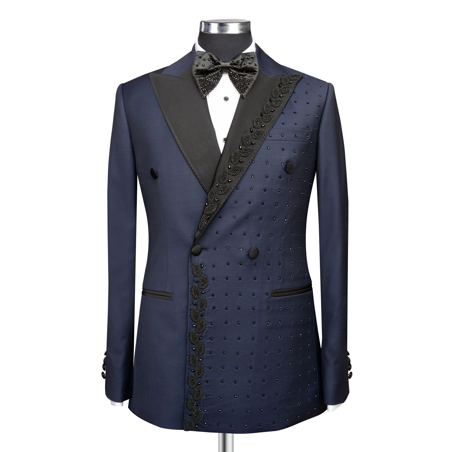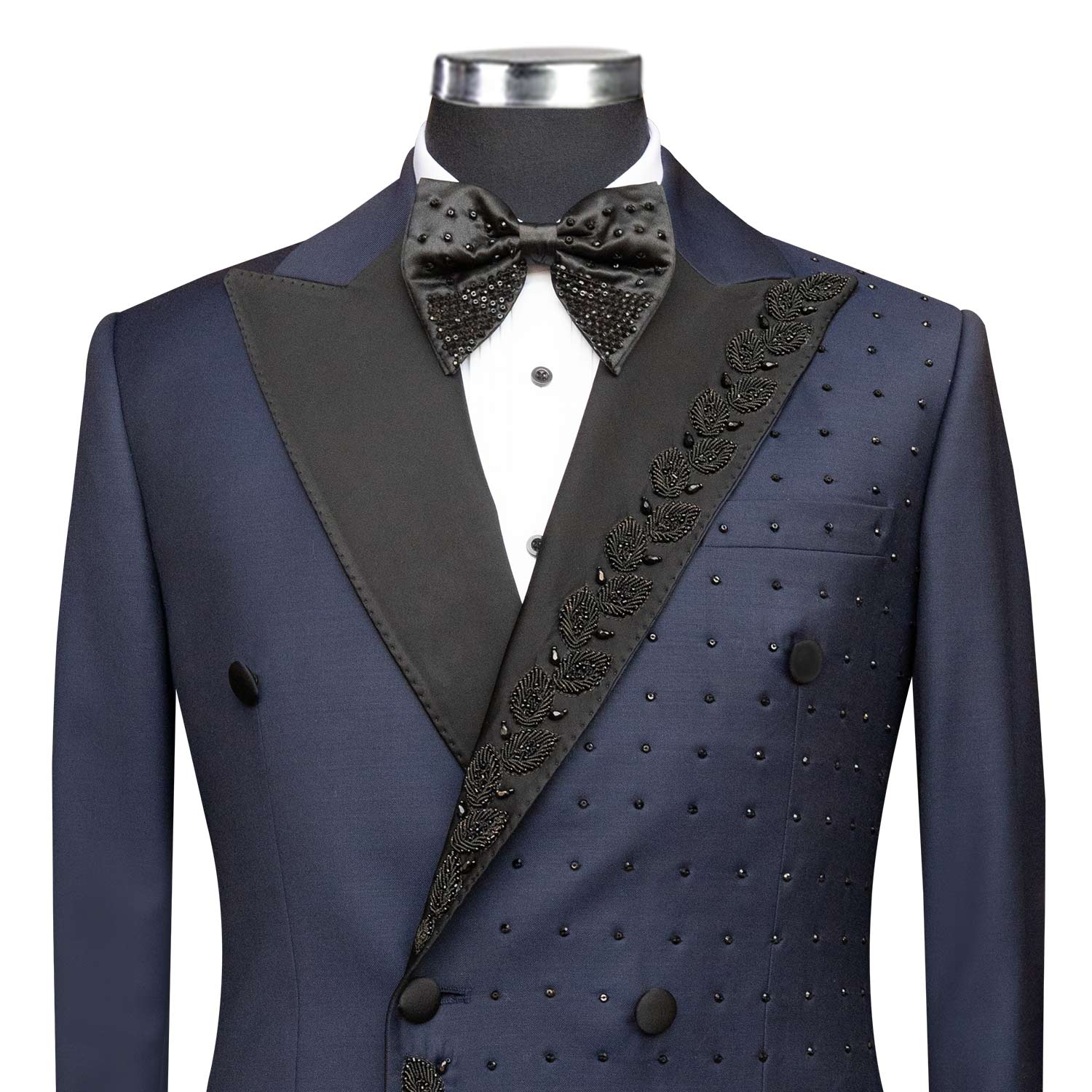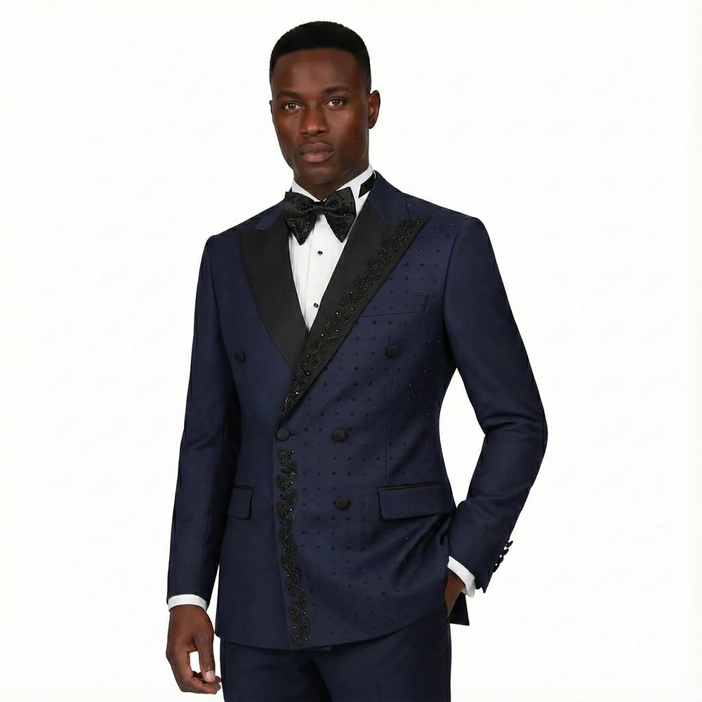 Discover the charm of our Custom Dark Blue Tuxedo with Black Lapel. Order now for an exclusive off, and elevate your style with Andre Emilio. Ideal for weddings, it boasts features like a black lapel, a double-breasted vest, and superior fabric quality for unrivaled style and comfort.