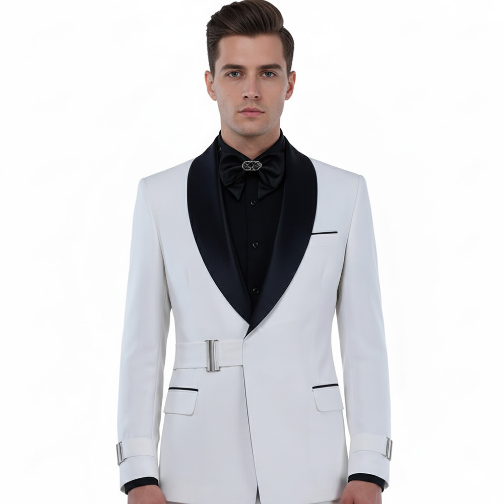 Clean and sharp, this white tuxedo suit features a black satin shawl lapel and a secure buckle closure for a modern touch. Tailored for comfort with a close-to-body fit, it’s a solid pick for weddings, prom, and any black tie night.